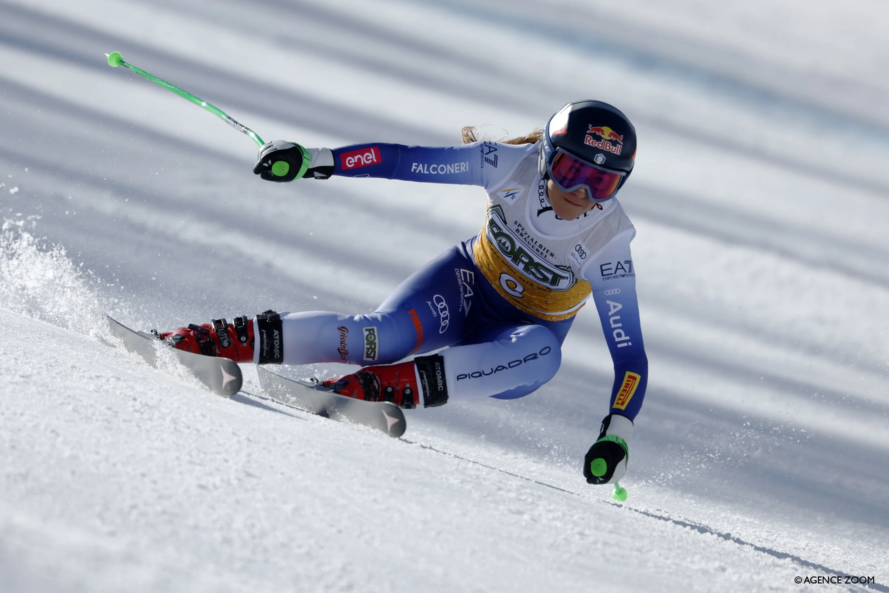 She finished a tiny margin (+0.06 seconds) ahead of Sofia Goggia (ITA/Atomic), who put in a trademark bombastic run, with local hero Federica Brignone (ITA/Rossignol) coming third.