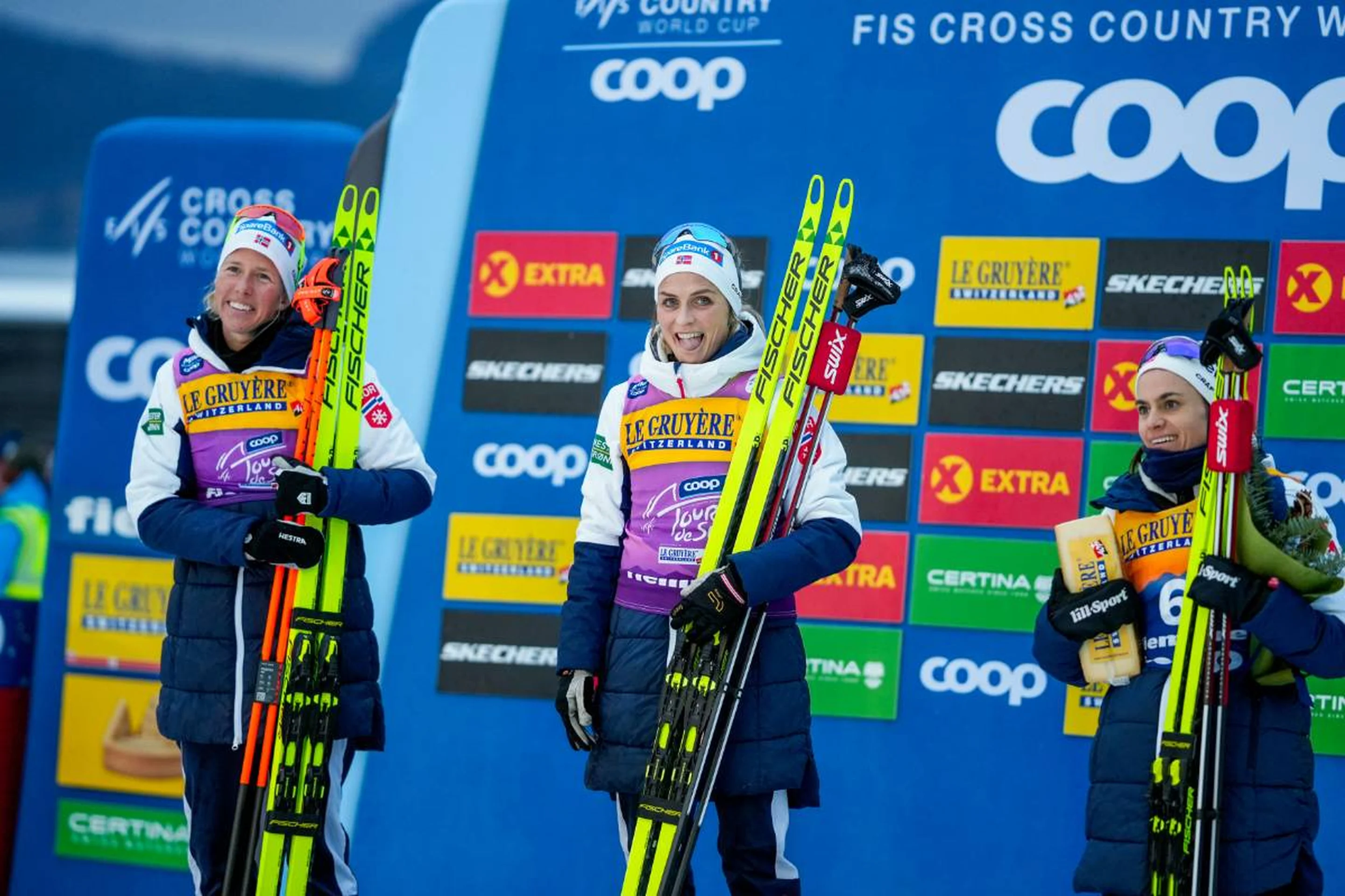 The overall Coop FIS Cross-Country World Cup runner-up could relax in the last 500m of the race. She grabbed a Norwegian flag to celebrate her achievement as she crossed the finish line 25.5 seconds before runner-up Slind as Weng completed the all-Norwegian podium, 28 seconds behind the winner.