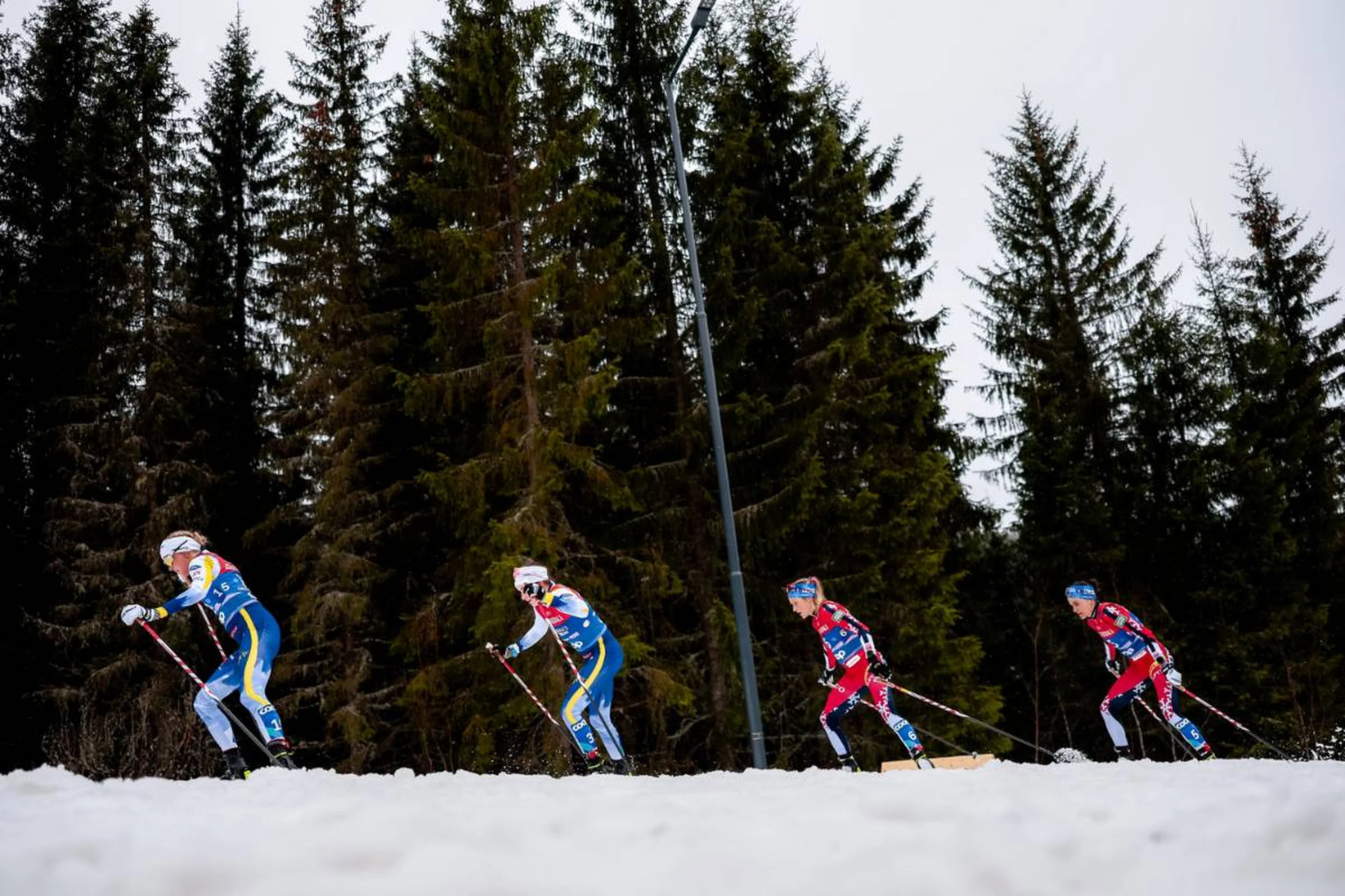 In challenging conditions, where slushy snow made the long championships grand finale even tougher to plow through, it took just about 10km for a top quartet of Karlsson, Johaug, Weng and Ebba Andersson (SWE) to break away from the rest of the pack.