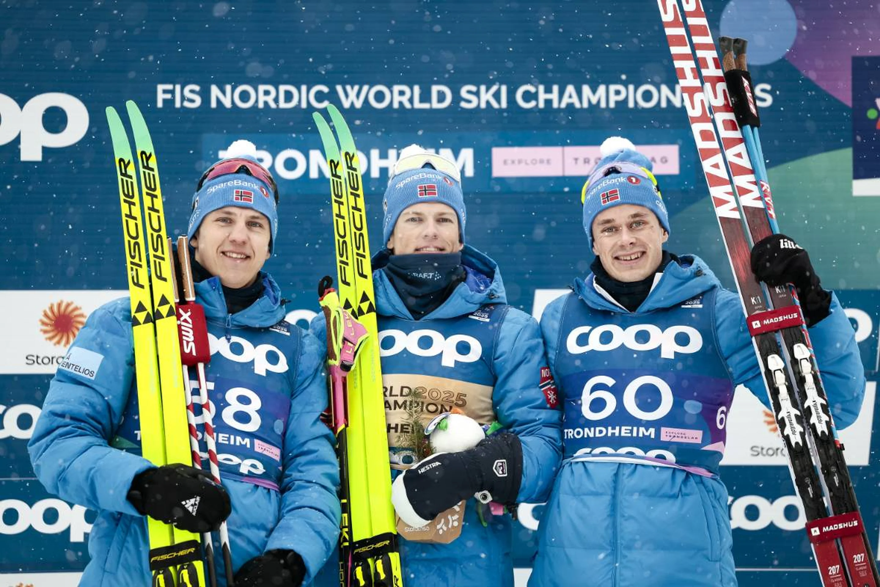 In heavy snowfall, the 28-year-old Trondheim local beat his teammate Erik Valnes by 8.8 seconds to claim his first world title in the event as Harald Oestberg Amundsen completed another all-Norwegian podium.