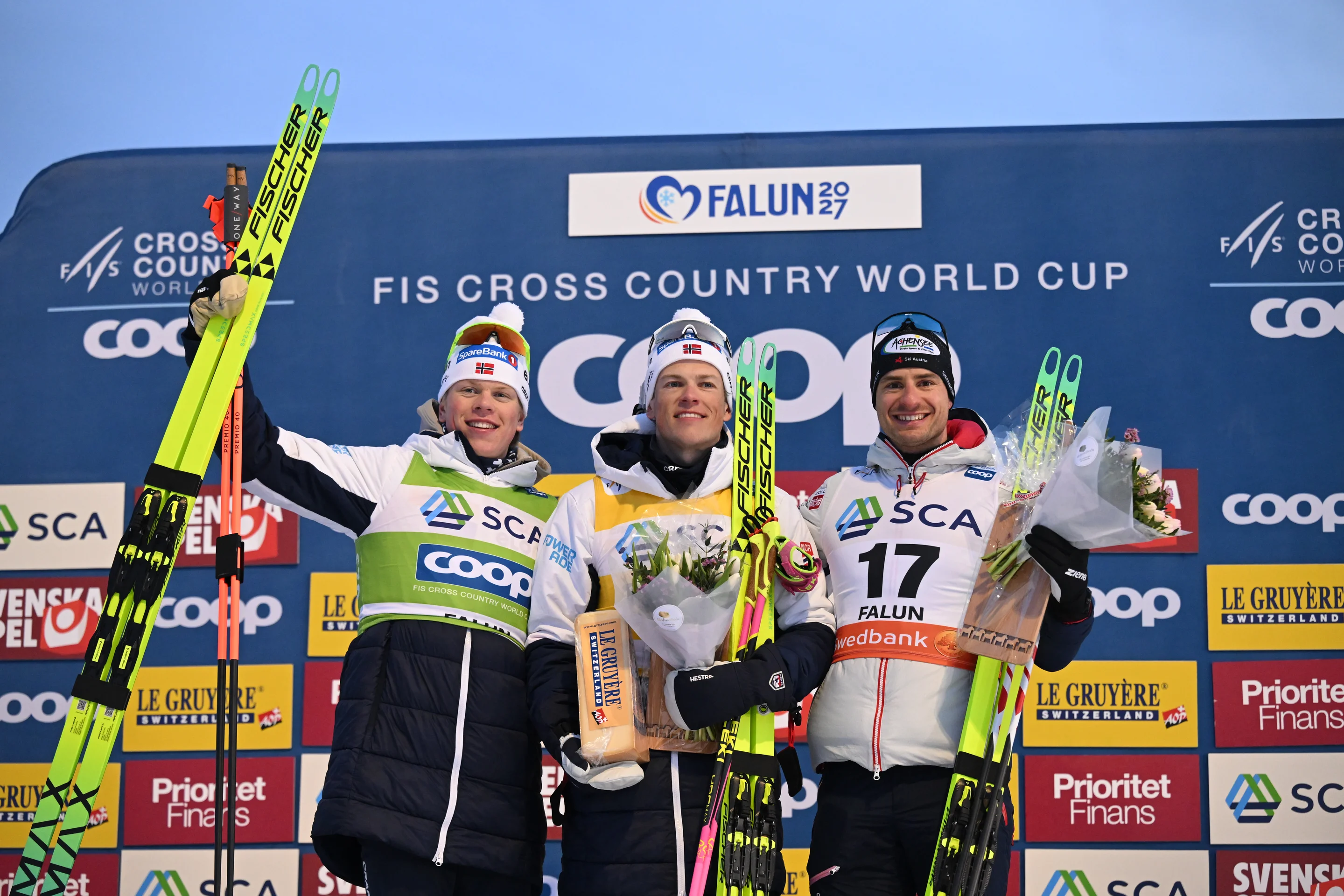 The first post-Olympic Men's World Cup podium (from left to right): Lars Heggen (NOR), Johannes Hoesflot Klaebo (NOR) and Benjamin Moser (AUT) @FIS/ActionPress/Jonathan Nackstrand