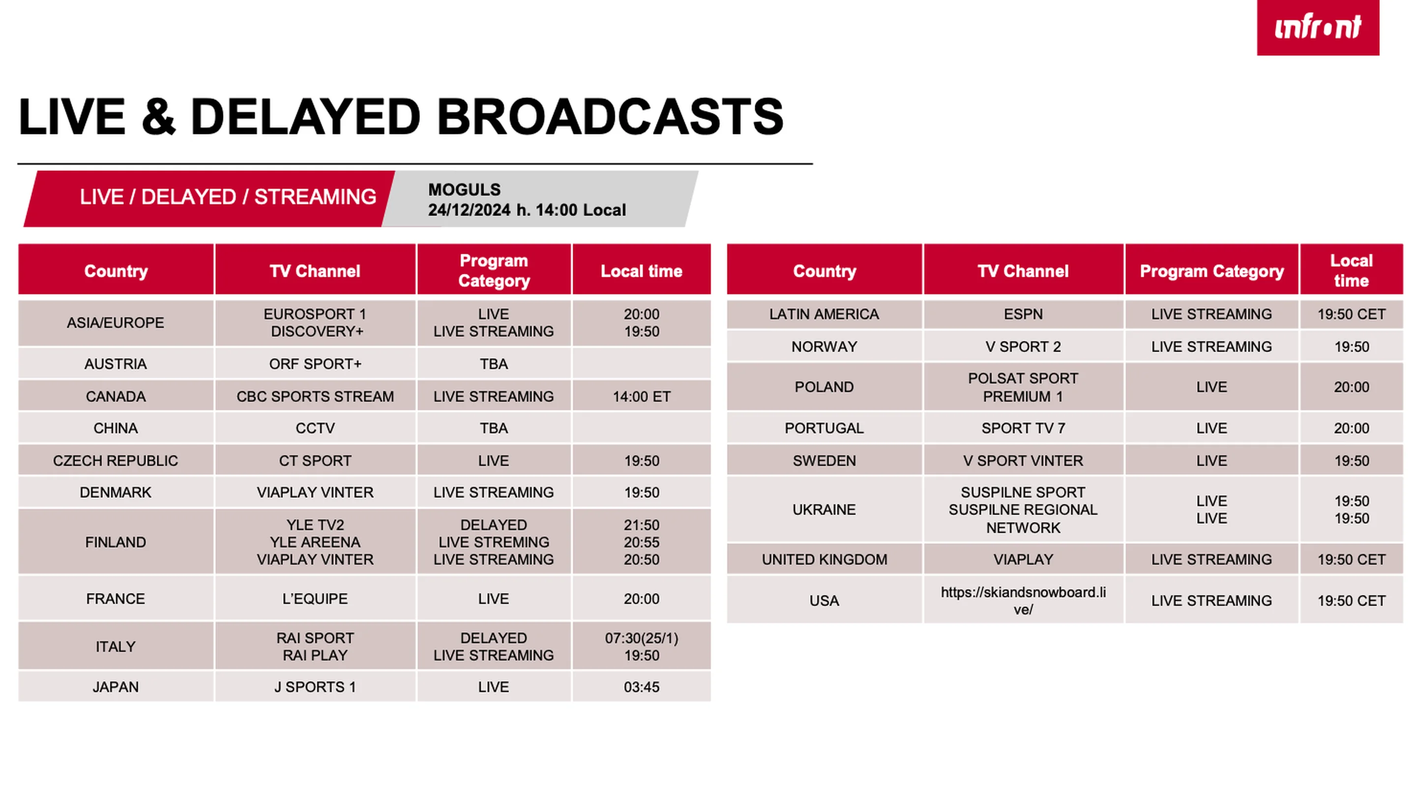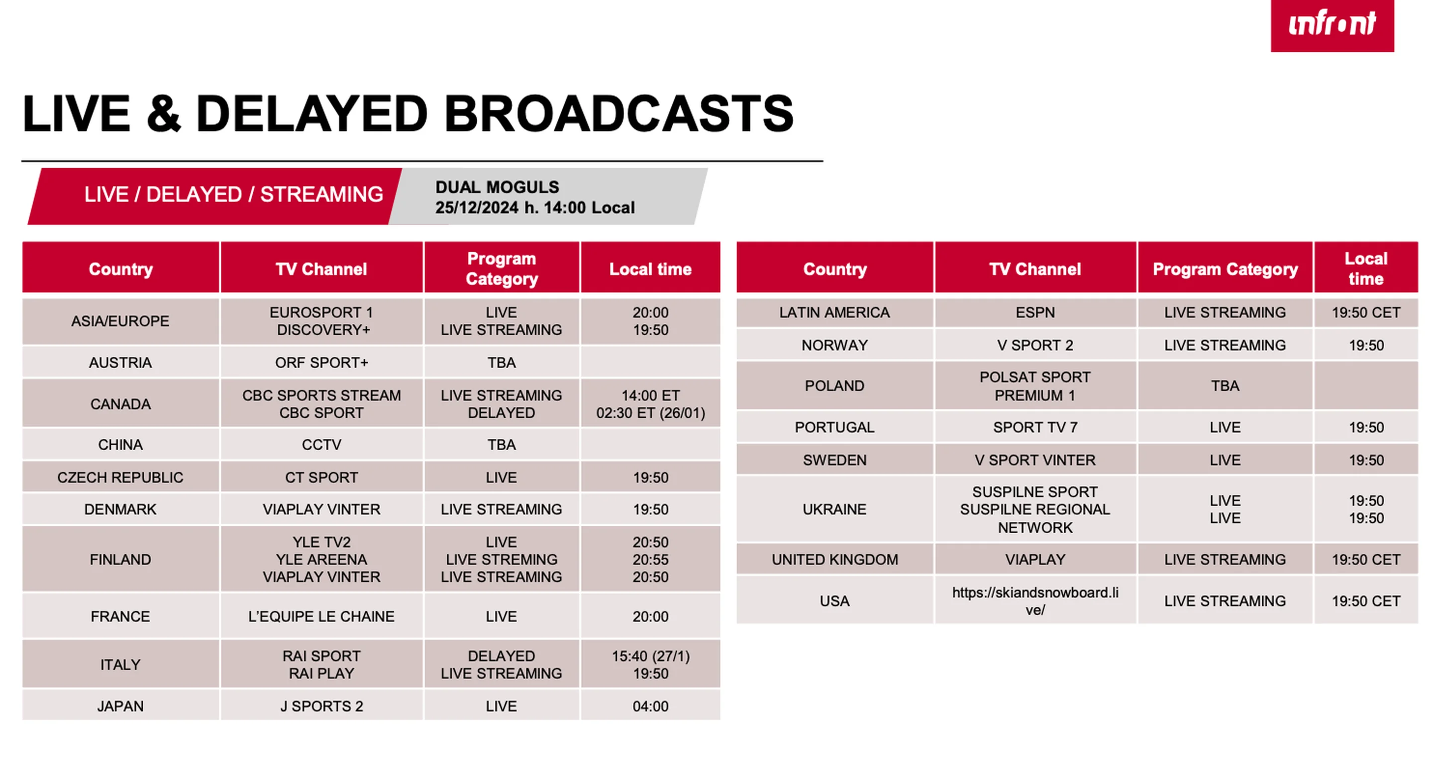 Extensive TV broadcast coverage is available for fans to follow the action, along with streaming on FIS TV. We invite you to join us live and help spread the word about the live streaming of the competition available on our YouTube channel.