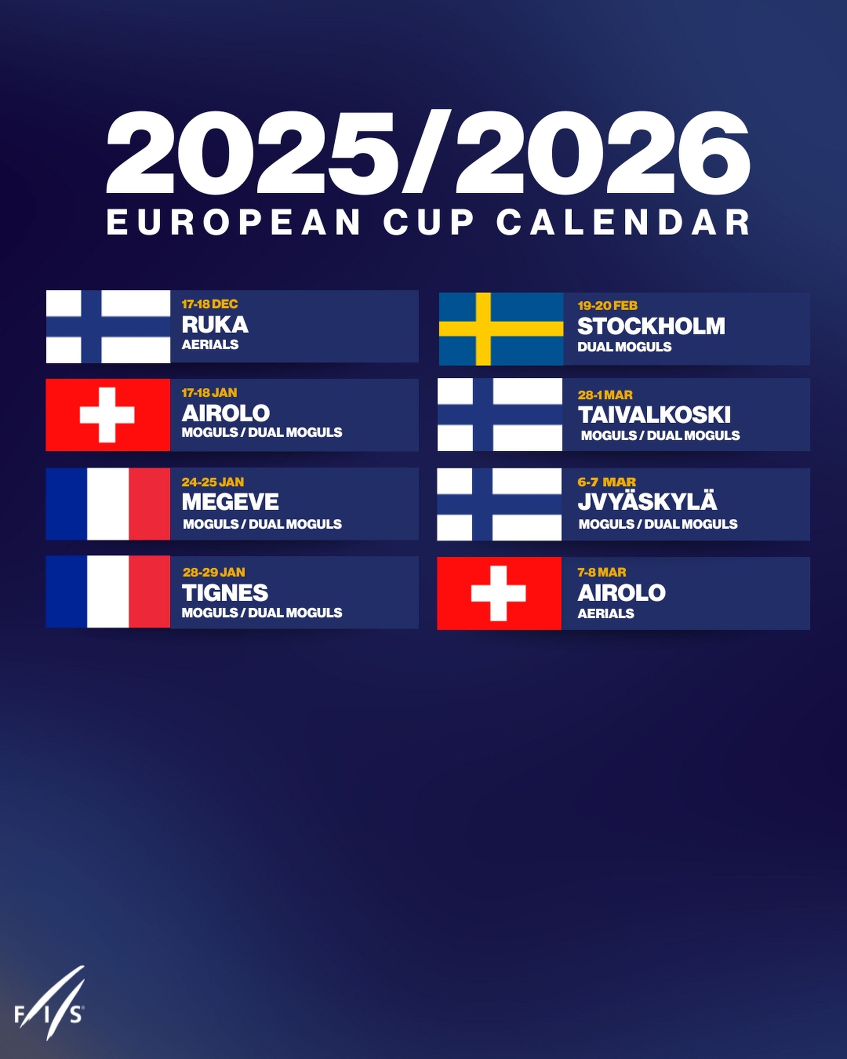 The European Cup will once again deliver a deep and diverse calendar of competitions across the continent, showcasing Europe’s top up-and-coming freestyle talent. The season launches early in Ruka, Finland (December 17–18) with aerials, before heading to Airolo, Switzerland (January 17–18) — a staple venue that returns for both moguls and aerials this season.