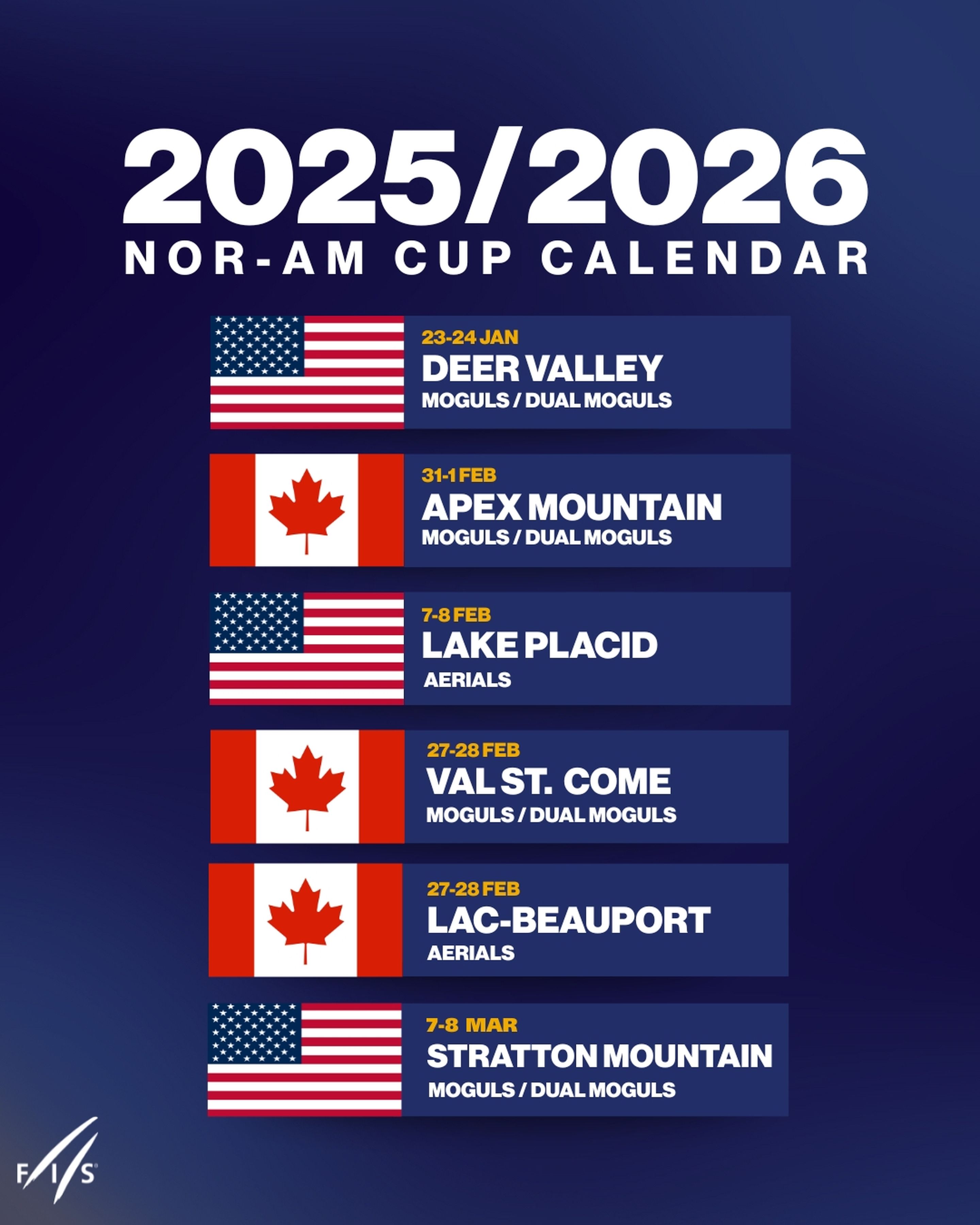 The tour then returns to Canada for a packed week at Val St. Come (February 26–27) and Lac-Beauport (February 27–28), where Canadian fans can expect intense competition and high-level performances in both moguls and aerials. The season wraps up in style at Stratton Mountain (USA) on March 7–8, with East Coast energy setting the stage for the NorAm finale.