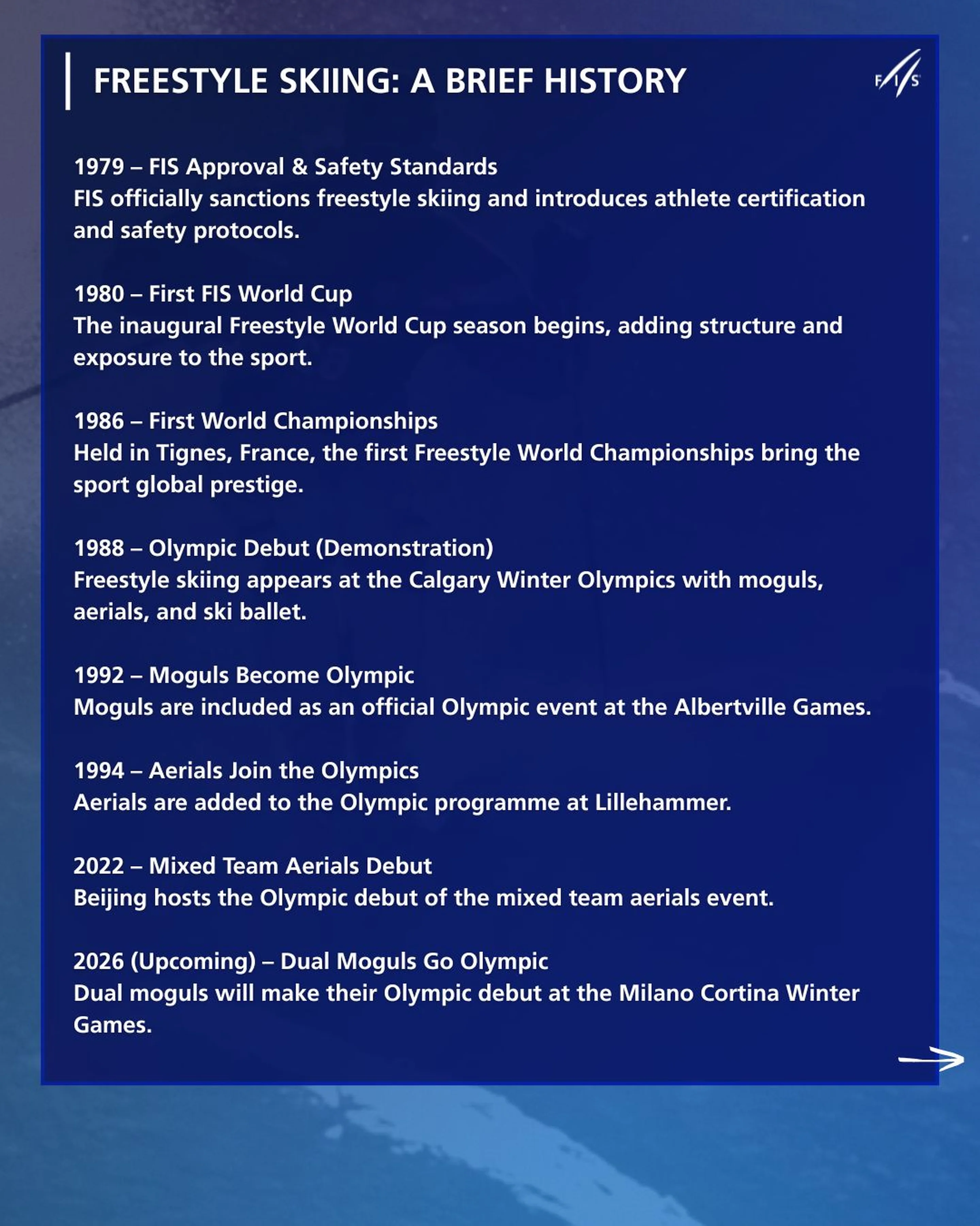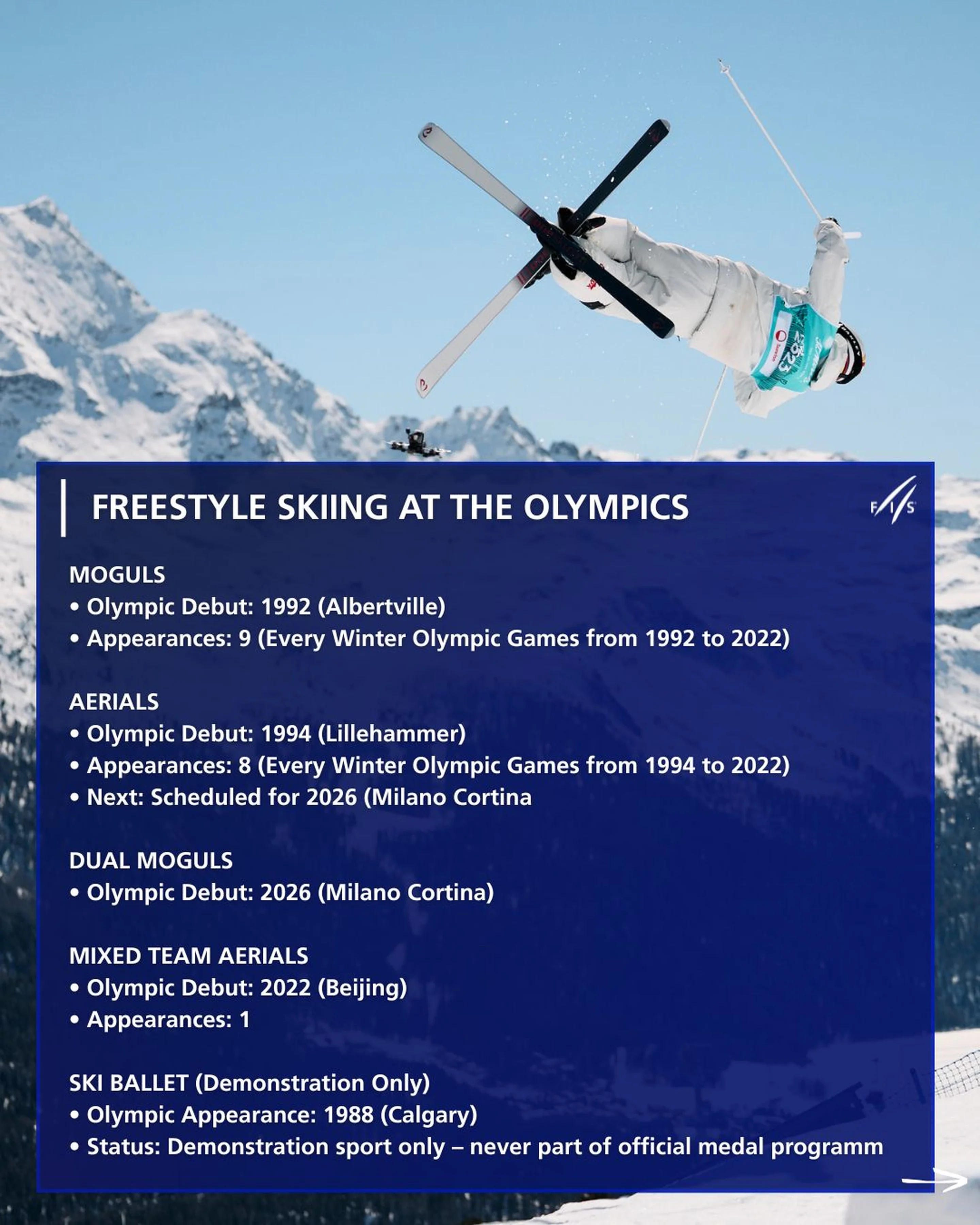 The Games in Italy will mark the 10th time freestyle skiing is included as a medal discipline at the Olympic Winter Games—a milestone worth celebrating. And just one year later, in 2027, the sport will mark 50 years since its official recognition by the International Ski Federation (FIS).