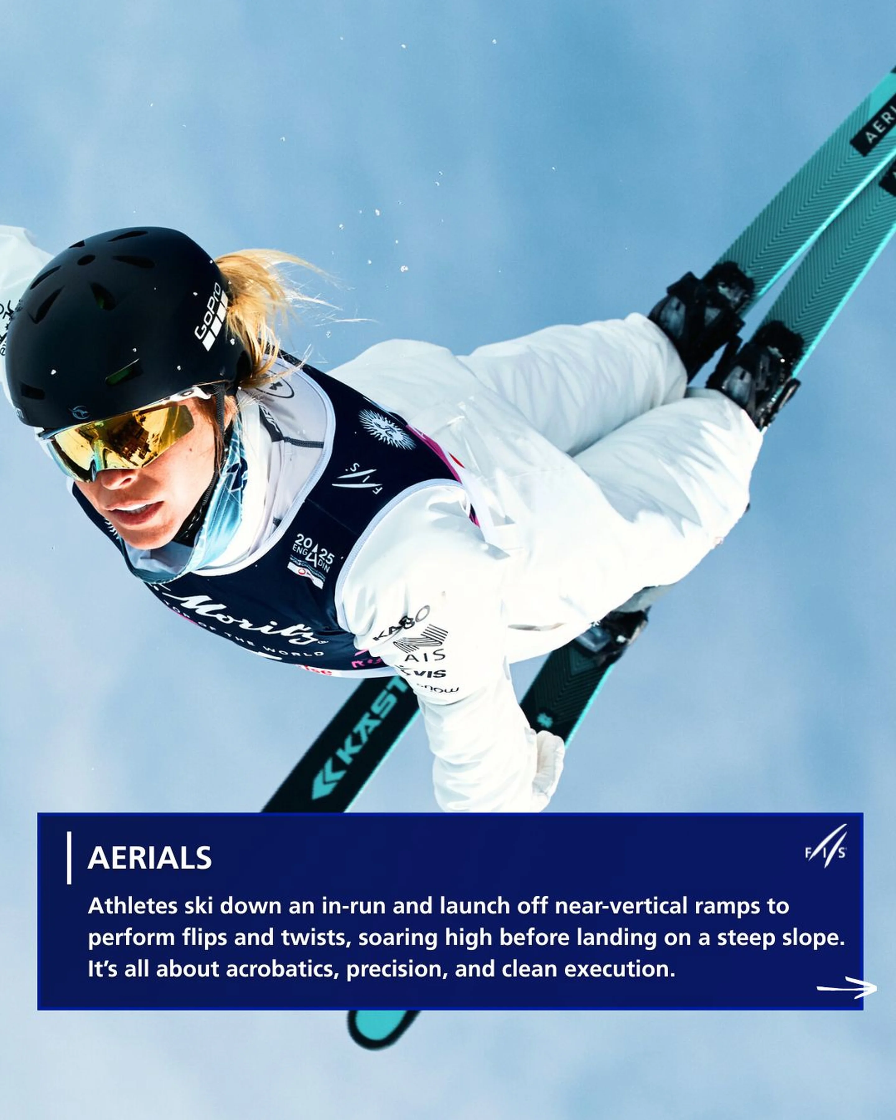 In aerials, athletes ski down an in-run and launch off a near-vertical ramp to perform high-flying flips and twists before landing on a steep slope. Each jump is judged based on: