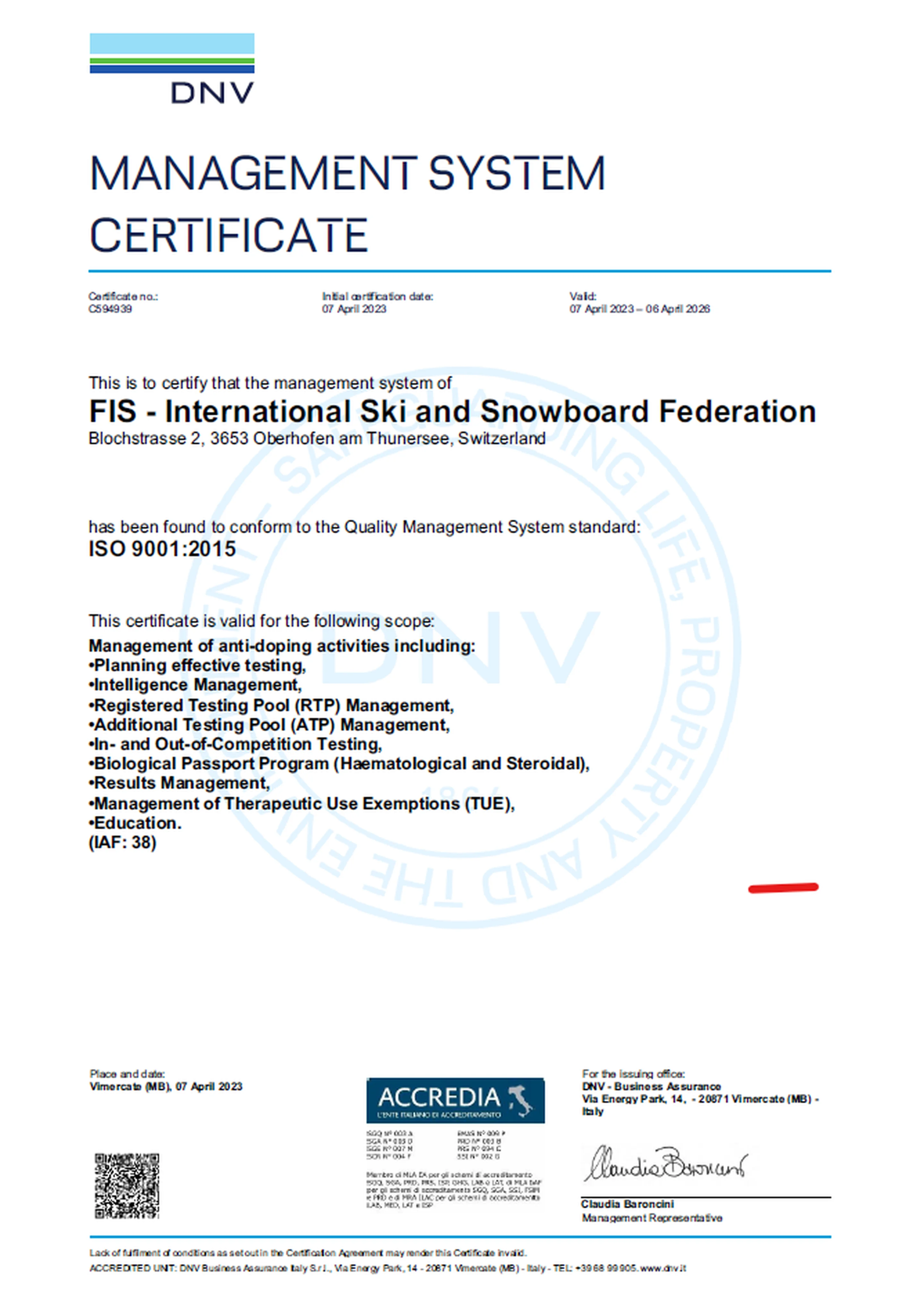 The International Ski and Snowboards Federation’s Anti-Doping Programme is certified to conform to the Quality Management System standard ISO 9001:2015.