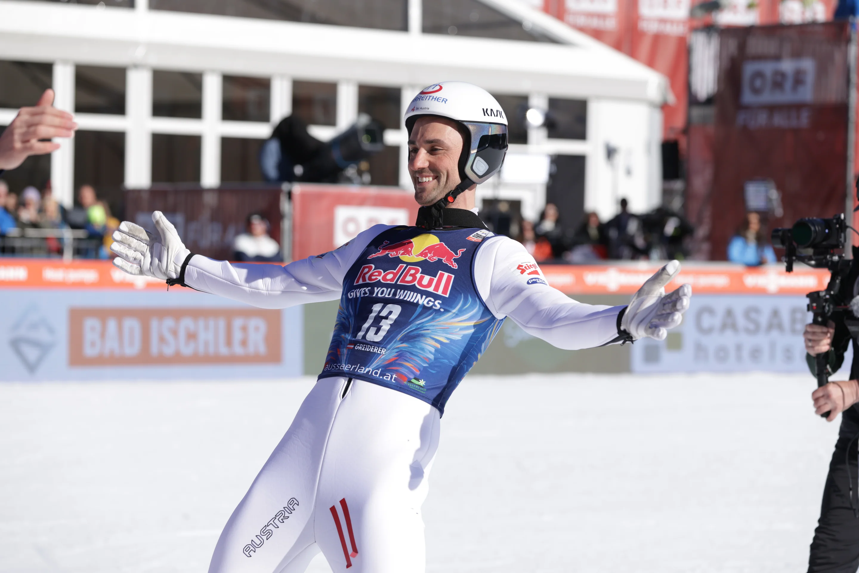 Lukas Greiderer (AUT), the 2022 Olympic Normal Hill bronze medallist competing in his final World Cup event, was also happy (below) with a 208.5m jump for 186.8 points, which left the 32-year-old 11th on the hill, before ultimately finishing 10th.