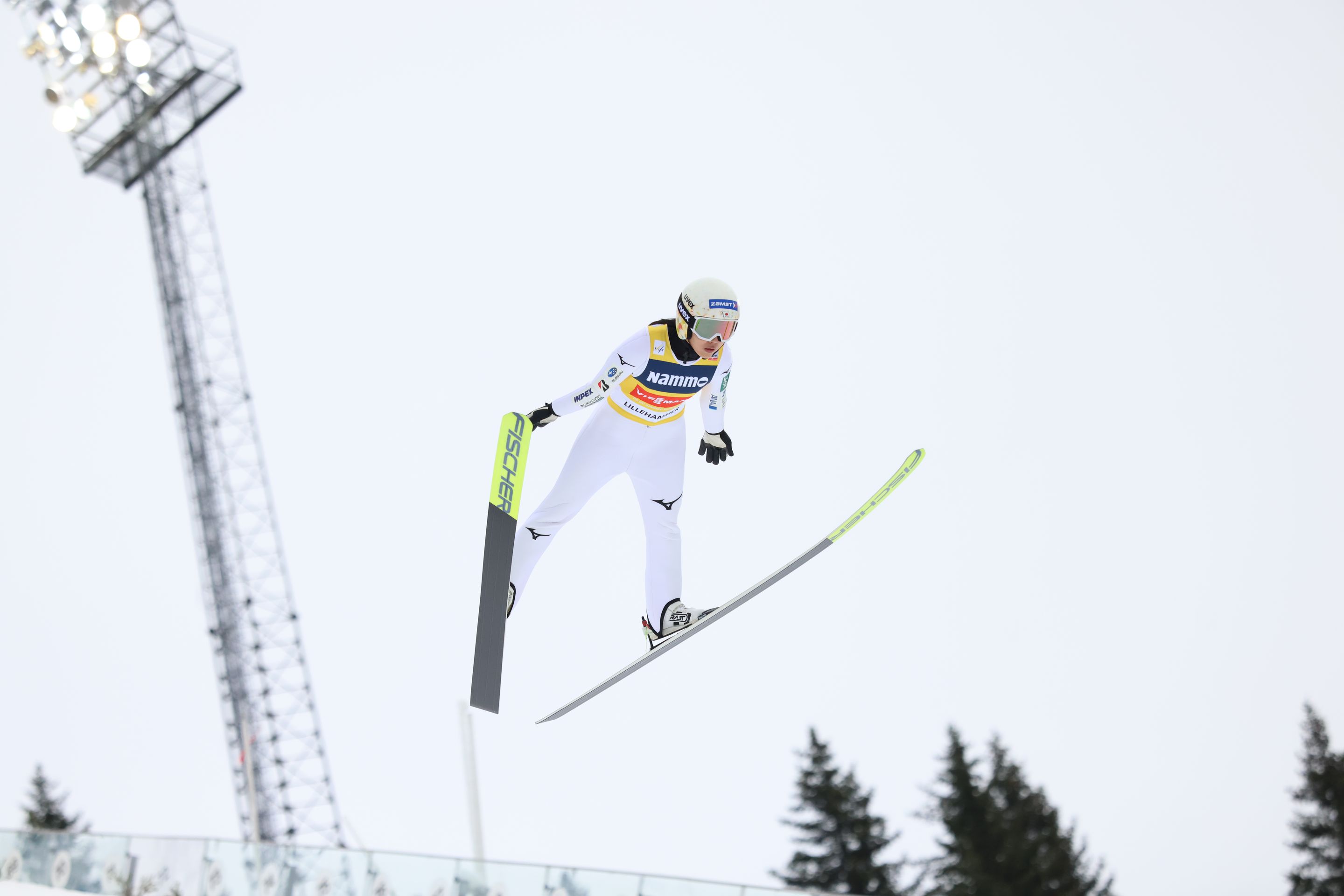 Double World champion and reigning Crystal Globe winner Nica Prevc (SLO) had placed a surprise 15th in the first Lillehammer World Cup, was much-improved 24 hours later and a jump of 128m, which scored 129.7pts, put her second at the halfway stage.