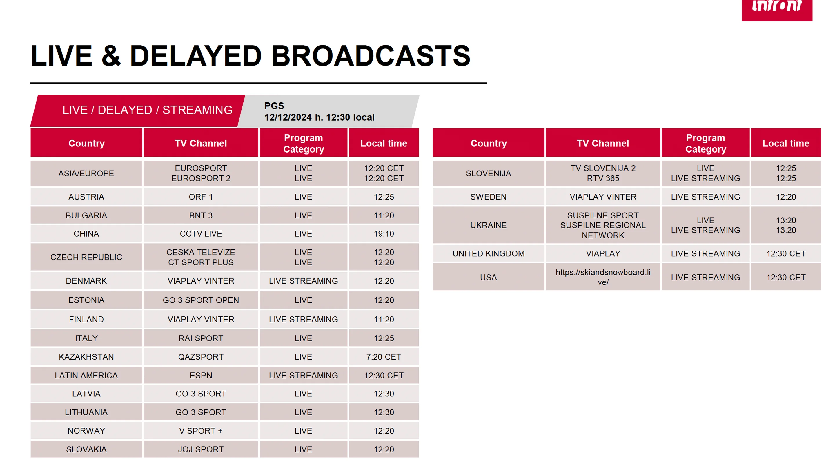 The December 12 PGS race in Carezza will involve opening qualifying runs followed by the finals at 12:30 CET. The December 14 PGS race in Cortina will follow the same format with finals races under the lights at 17:30 CET.